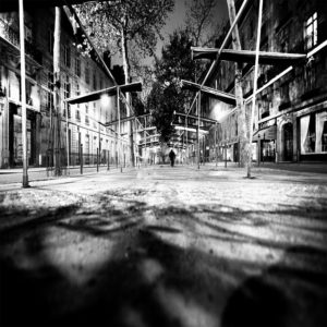 Nächtliches Dunkel wirkt auf mich inspirierend. Unterstützt von scharfzeichnenden Gaslaternen oder Karbidlampen mit warmem Farbton fotografiere ich Fassadenkonturen und Silhouetten, die sich durch obskure Schattenwürfe in lebendige Zauberwesen verwandeln. In nächtlicher Stille und Dunkelheit mit der Kamera zu arbeiten, fordert und fördert meine Wahrnehmung. Der französische Nobelpreisträger Patrick Modiano verarbeitet in seinem Roman Chien de printemps Photographie und Vergänglichkeit zu einem Werk existenzieller Tiefe. In einer Textpassage schreibt er: …ein Photograph sei ein Nichts, er müsse verschmelzen mit dem Ort, mit dem Dekor, habe unsichtbar zu sein, um besser arbeiten zu können, und um das … natürliche Licht einzufangen. Man sollte das Klicken der Rolleiflex nicht hören… Dem kann ich nur applaudierend beipflichten!